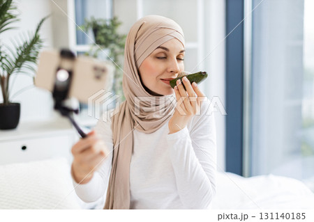 Young Muslim woman in beige hijab holding smartphone on tripod sharing skincare tips using avocado. She discusses natural beauty methods while creating engaging and insightful content in a cozy home