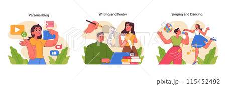 Self expression set. Digital content creation, literary artistry, and rhythmic movements. Making up stories, composing poetry. Blogging, writing, and performing arts depicted. Flat vector illustration