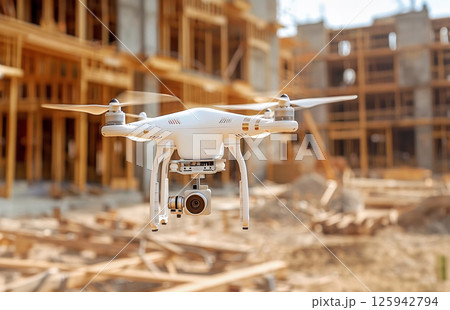 Unmanned Aircraft System (UAV) Quadcopter Drone In The Air Over Construction Site. Technology development concept.