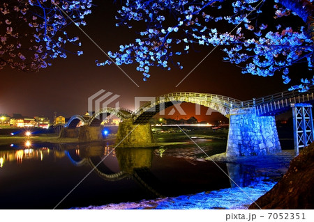 ライトアップされた錦帯橋とサクラ