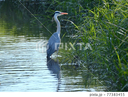 黄昏の水辺に佇むアオサギ