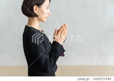 お葬式・お通夜で喪服を着て合掌をする若い女性