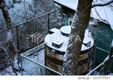 雪が積もった貯蔵タンク