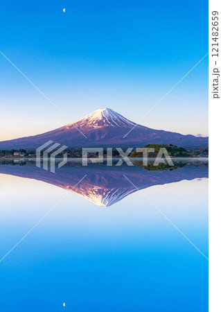 【富士山素材】河口湖に完璧に映り込んだ朝焼けの富士山【山梨県】