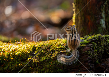 苔むす倒木の上に立つエゾシマリス