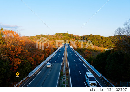 岐阜のインターチェンジ付近の高速道路の風景 ドローン空撮