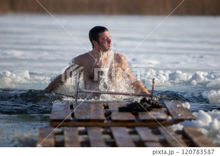 A man bathes in an ice hole on the Orthodox feast of the Epiphany. Plunge into the icy water.