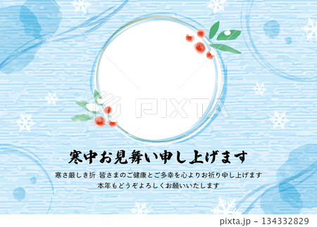寒中見舞いフォトフレーム_水色の和紙風背景と水彩風あしらい_横
