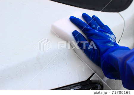 車のボディを白いスポンジで手洗い洗車