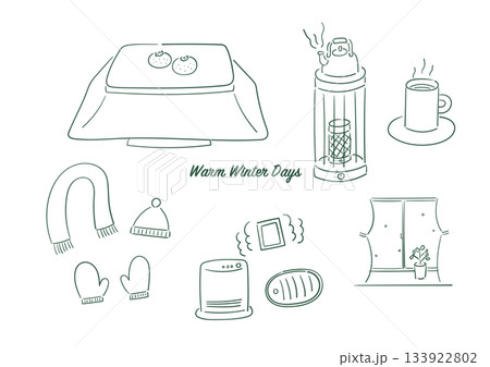 冬の日常とあたたかさの手描き線画イラストセット