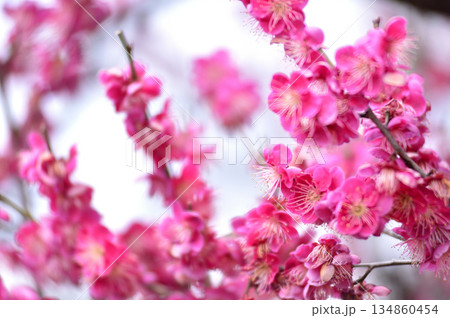 新春を告げる満開の清楚でかわいい淡いピンクの紅梅