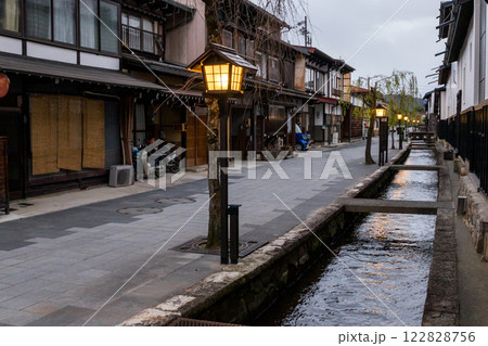 【飛騨古川】夕刻の瀬戸川と白壁土蔵街の街並み