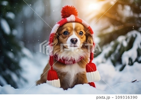 Cute dog in winter landscape and christmas time comeliness