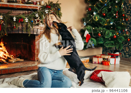 A smiling young woman is playing with a dog, sitting on the floor near the fireplace, on Christmas Eve. Christmas mood, Christmas holidays. The concept of Christmas and New Year
