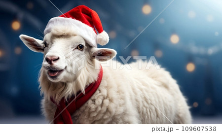 Illustration of a happy cute white sheep wearing a red Santa Claus hat and scarf posing on a winter snowy background. Conceptual digital painting illustration. Generative AI