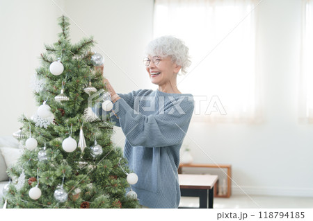 クリスマスツリーに飾り付けをするシニア女性