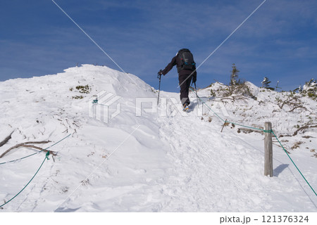 冬の北八ヶ岳、北横岳山頂を目指す登山者