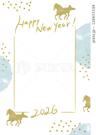 2026年・金色の馬と水色アクセントの年賀状テンプレート