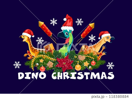 Dino Christmas greetings with funny Santa dinosaurs in wreath for winter holiday, cartoon vector. Happy Jurassic dino lizards and dinosaurs in Santa hats with poinsettia, firecrackers and snowflakes