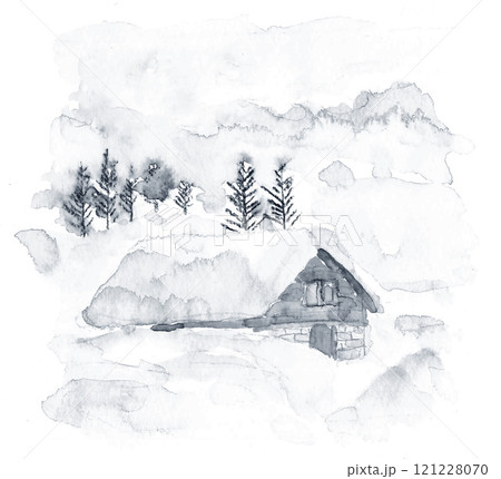 水彩で描いた雪景色の手描きモノトーンイラスト素材
