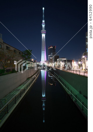 東京スカイツリー冬雅と屋形船の浮かぶ隅田川の夜景