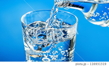 Refreshing drink. Glass of sparkling water with bubbles, green mint leaves and yellow lemons on blue background. Refreshment in the heat. Healthy banner lifestyle and nutrition. Vibrant Citrus. Detox.
