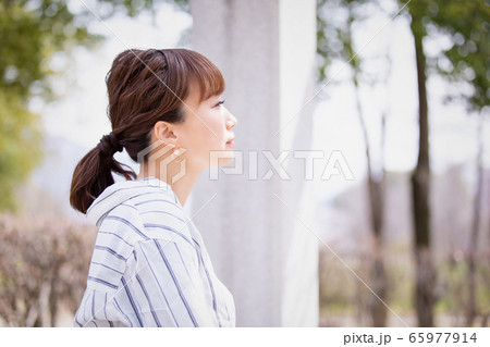 屋外にいるアジア人女性の横顔(悲しい, ぼんやり, 呆然)