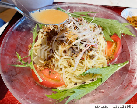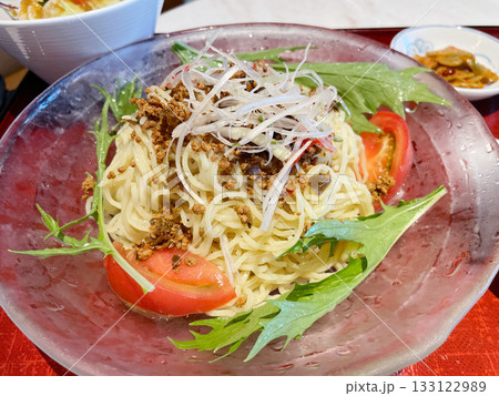 夏におすすめ、冷やし担々麺。ひやしタンタン麺、冷やし担担麺。冷たい麺料理。