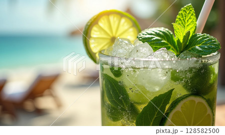 Mojito Cocktail Macro with Crushed Ice, Mint Detail, and Lime Sparkle in Tropical Light