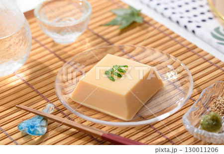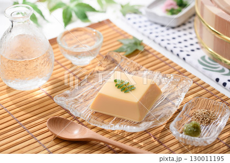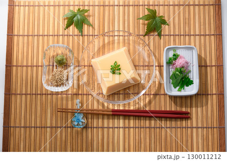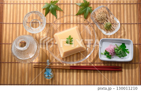 涼やかな夏の和食 透明ガラス器に盛られた玉子豆腐と薬味 涼感あふれる上品な料理イメージ