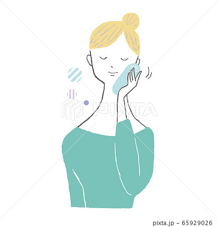 冷たいタオルで火照った肌をアイシングしてる若い女性のイラスト。
