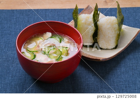 冷や汁とお握り、冷たい味噌汁、郷土料理、夏料理、冷たい味噌汁。具材はキュウリ、鯵干物、豆腐、ミョウガ