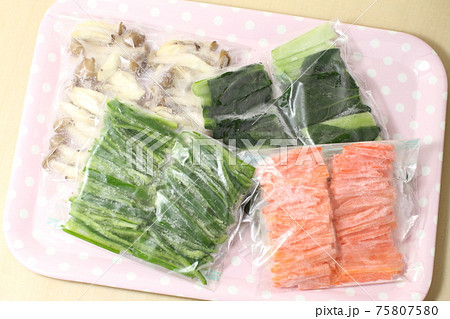 フリーザーバックに入ったカット野菜、野菜の冷凍真空パック保存、四種類