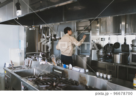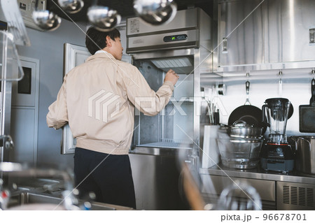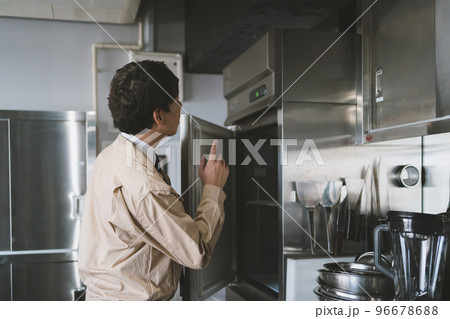 業務用厨房器具を確認する男性スタッフのイメージカット 業務用冷蔵庫