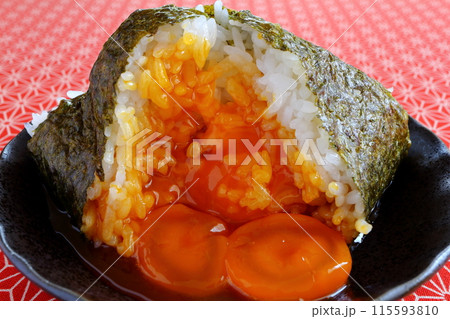 赤背景の卵黄おにぎり