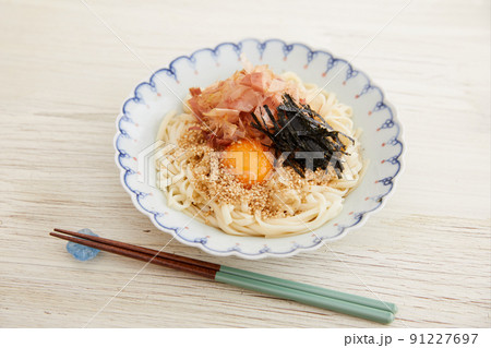 鰹節と卵黄と海苔がかかった健康的なぶっかけうどん