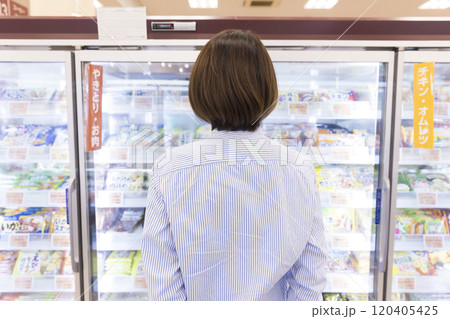 スーパーで冷凍食品を見る女性後ろ姿 買い物シーン