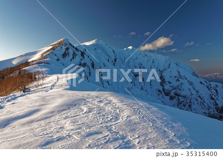 北アルプス・冷池付近から見る午後の光線に雪面の光る立山連峰