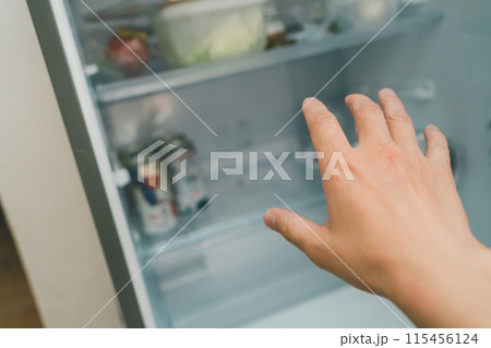 冷蔵庫を開けて食材を取り出そうとしている男性の手