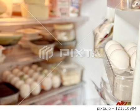 ドアを開いた冷蔵庫の中のたくさんの卵