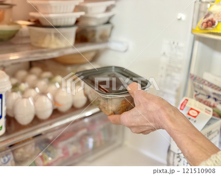 冷蔵庫から保存容器を重ねて取り出す高齢女性