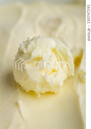 Creamy vanilla ice cream scoop on smooth background, close-up food texture