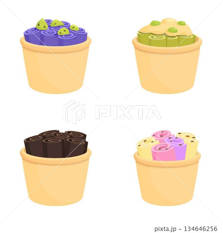 Thai icecream icons set cartoon vector. Various rolled ice cream in cup