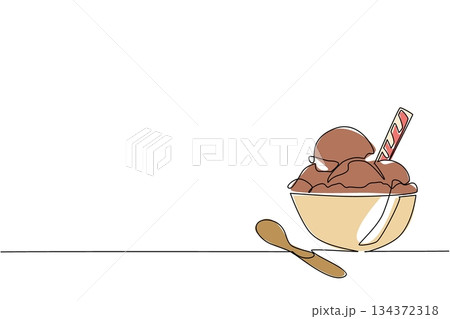 One line drawing of a bowl of rocky road ice cream with scoops, wafer stick, and spoon, celebrating National Rocky Road Day in a minimalist food concept vector style.