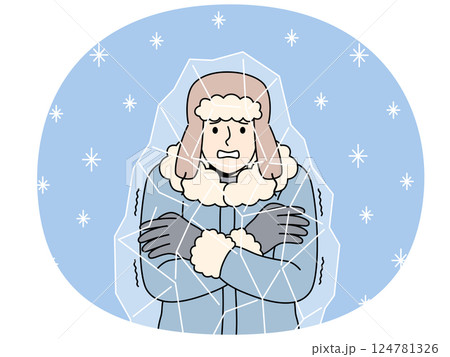 Frozen man stands inside block of ice and chatters teeth, suffering due to sudden climate change