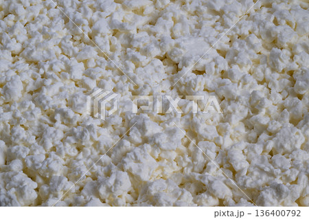 Closeup curd cheese mass showing crumbly white clusters, artisan cheesemaker inspection implied, rustic farmhouse mood, soft natural light highlighting texture and milk fat