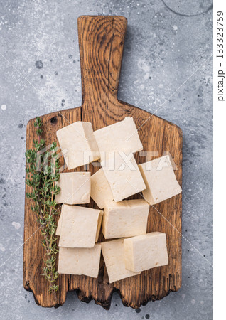 Organic Diced soy tofu cheese on wooden board. grey background. top view