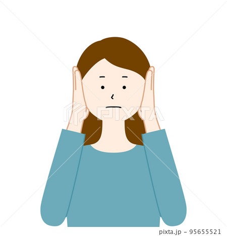 両手で耳をふさいでいる女性のイラスト・聞かざる(白背景・ベクター・切り抜き)