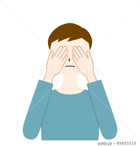 両手で目をふさいでいる男性のイラスト・見ざる(白背景・ベクター・切り抜き)