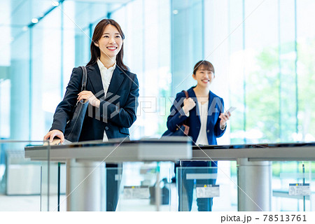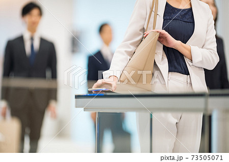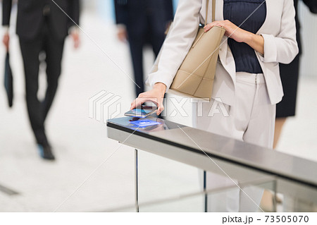 スマホでセキュリティゲートを通る女性 撮影協力「LINK FOREST」